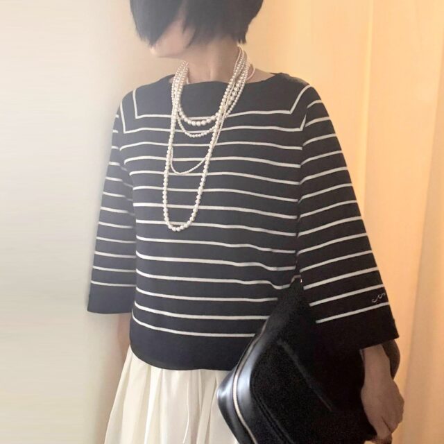 カシミアストールと、パンプスと、ピアスに 朱赤を投入。