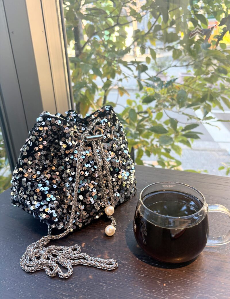 バッグもこのキラキラスパンコールのbagが最多登場。気楽に丸めてバッグの奥にぎゅーって詰めれるので良い。型崩れ気にしなくていいディナーbag。